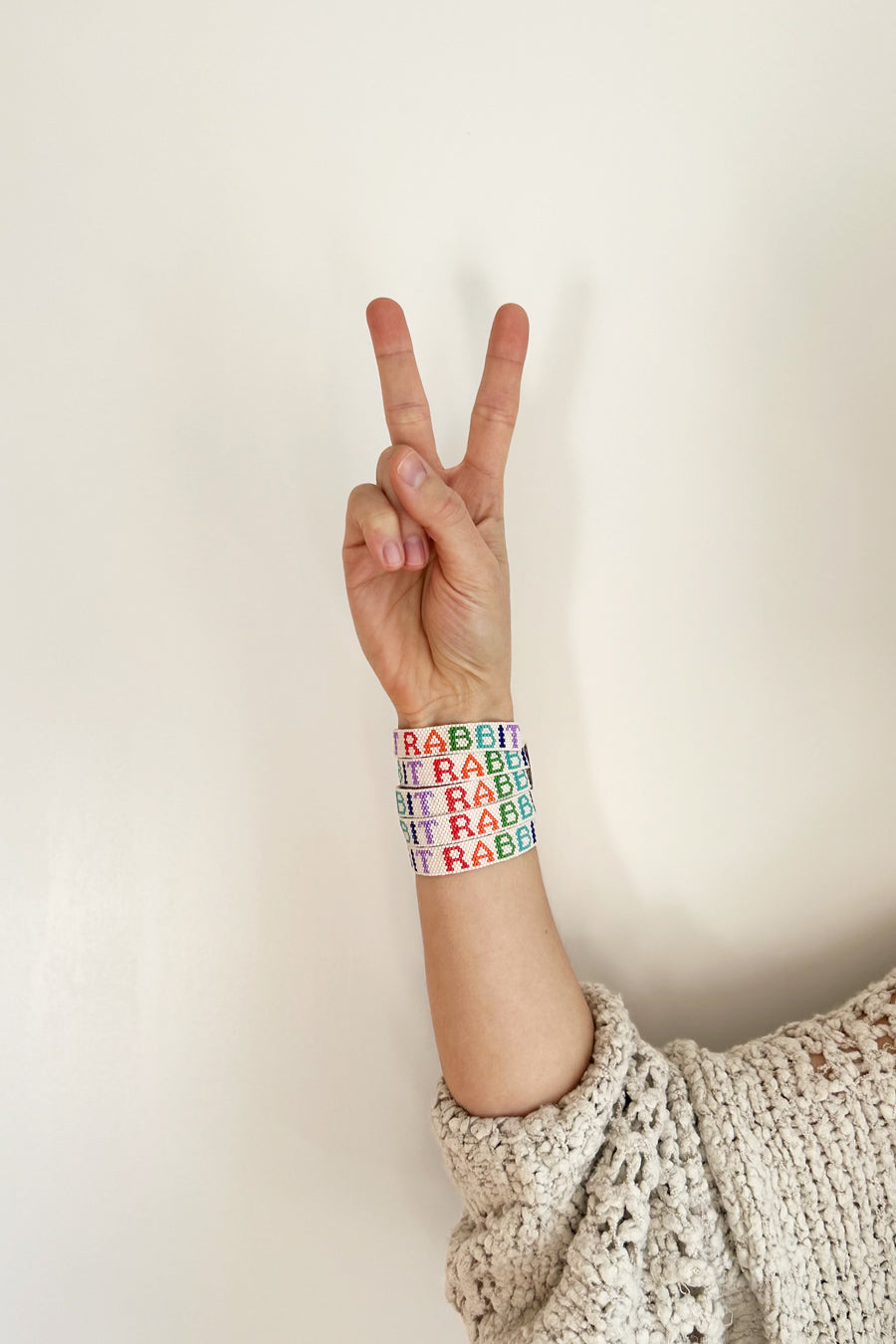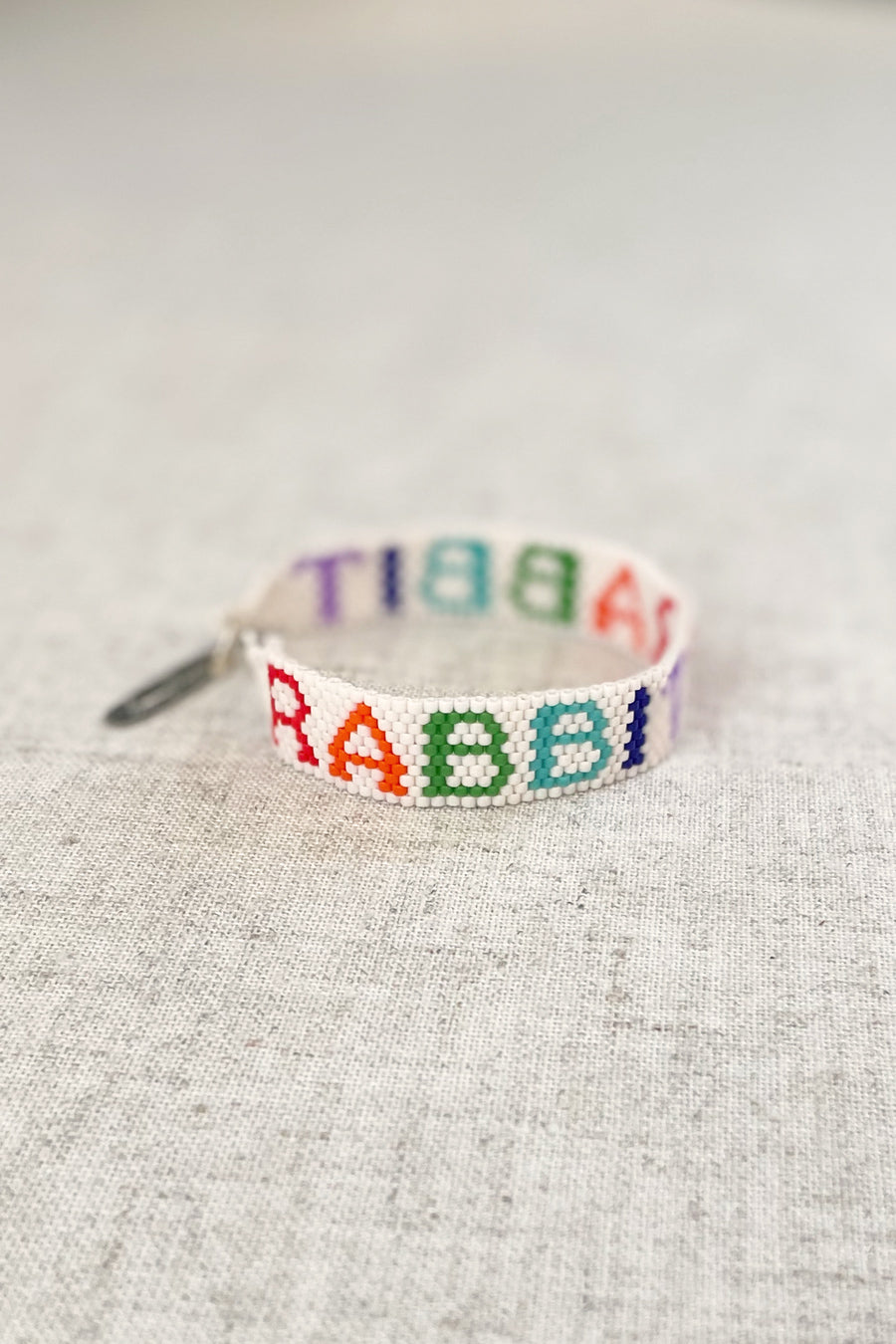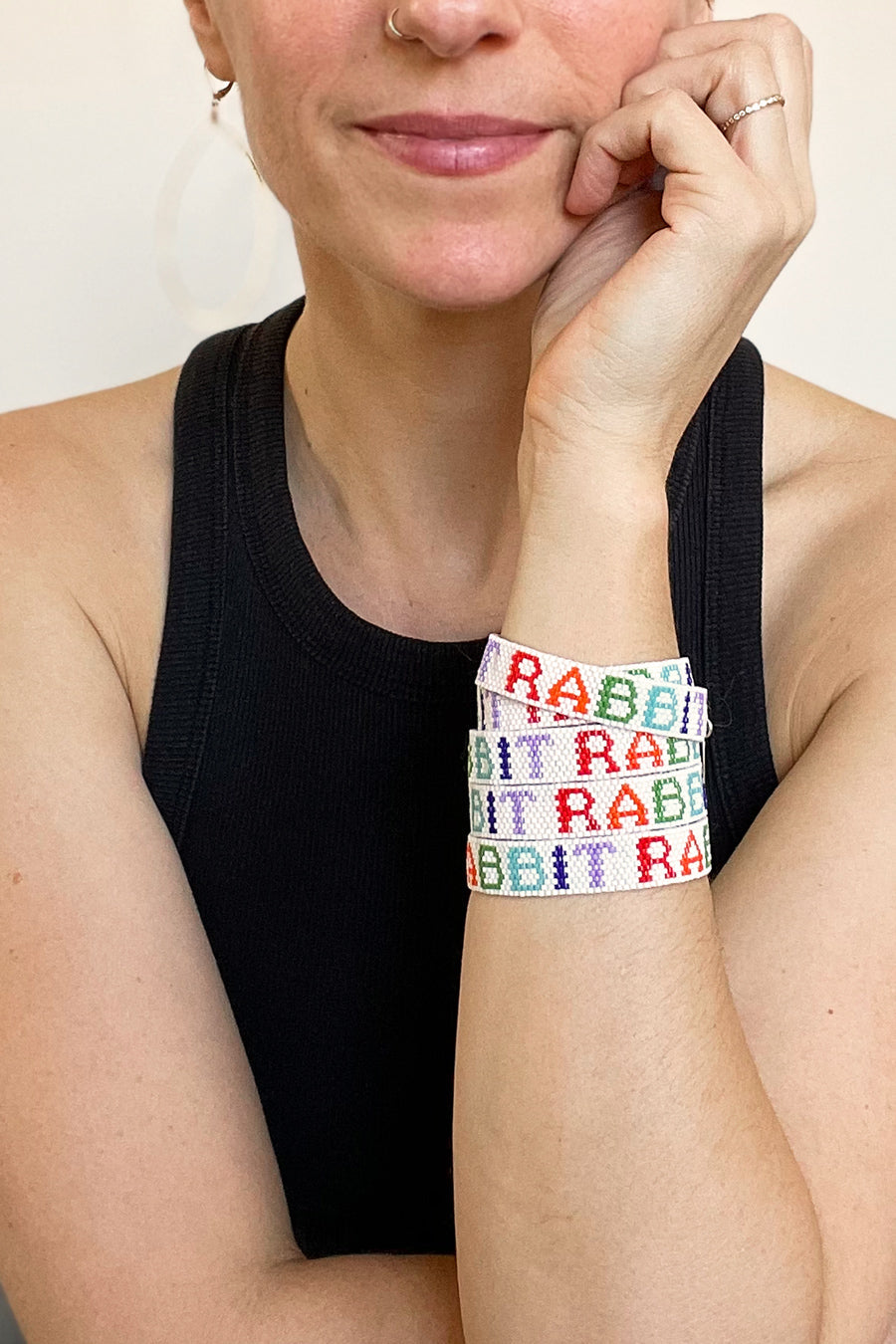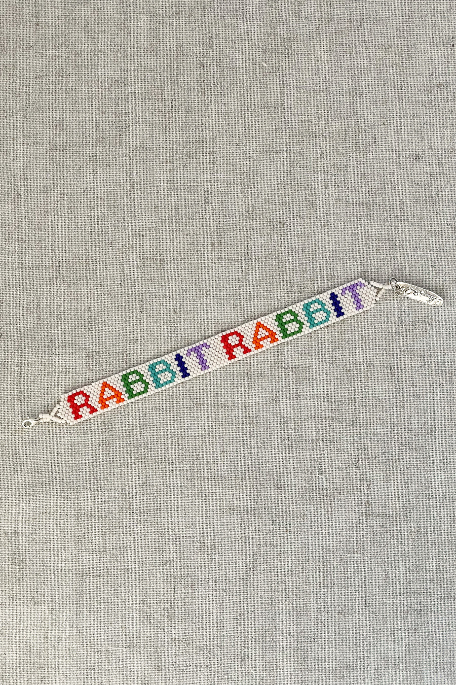 Hand-beaded by Bunny Shapiro, in Puerto Vallarta, MX, these delicate glass Japanese seed bead bracelets are hand-woven together with the 'Rabbit Rabbit' message in two options; contrasting black + white or in a splash of rainbow.